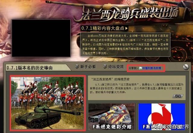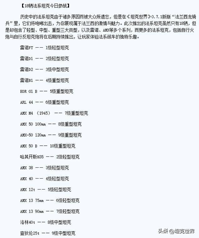 《坦克世界》0.7.1:F系升级线版本:“法兰西龙骑兵”。F系坦克升级线路正式加入到游戏当中。