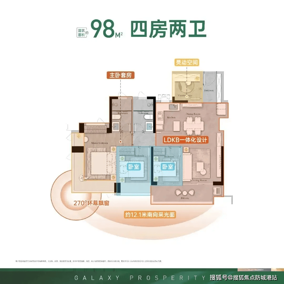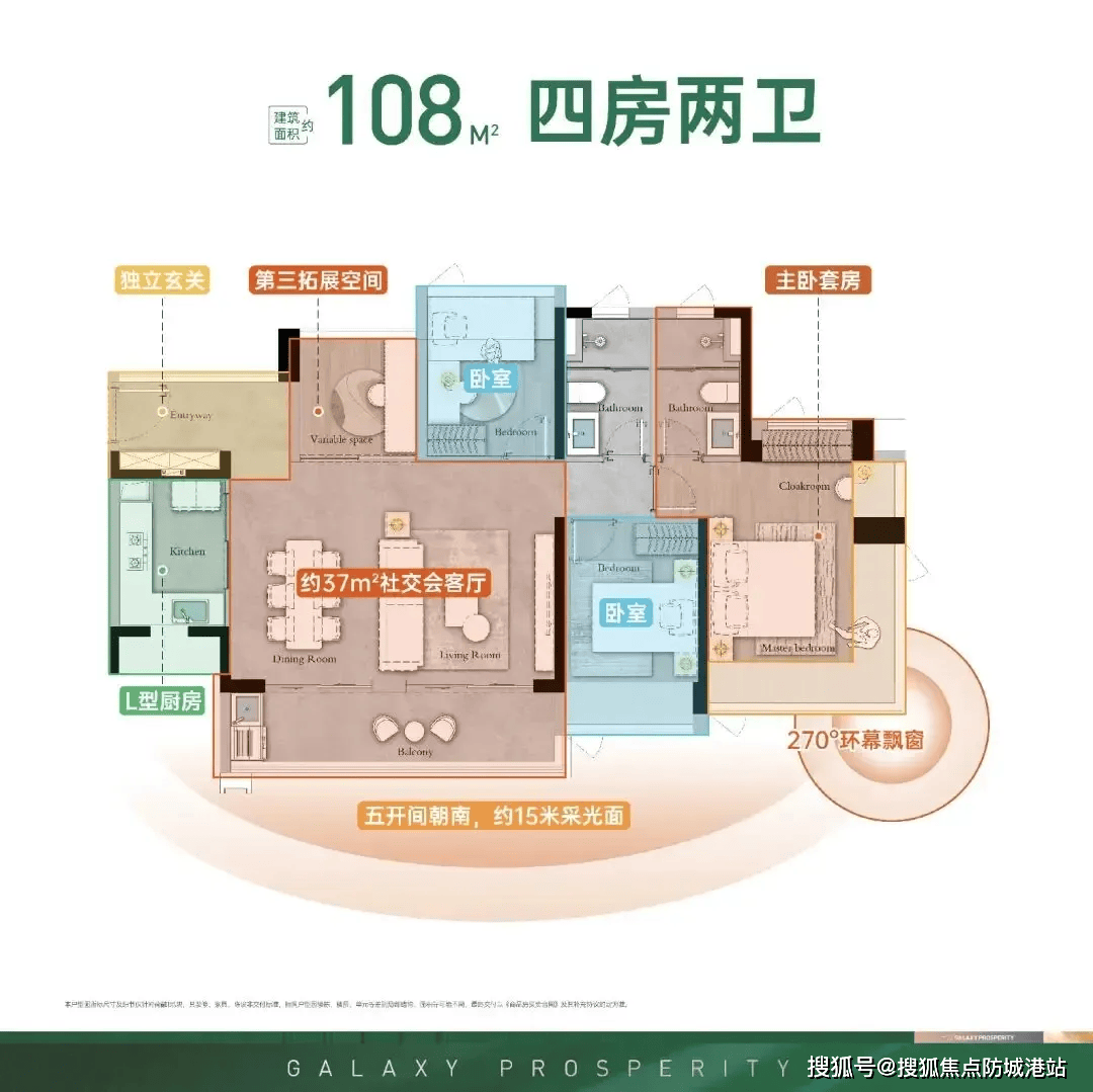 108㎡四房两厅两卫则是改善首选户型,专为追求高品质生活的家庭打造。该户型采用五开间朝南的设计,拥有约15米南向采光面和超6米跑道式阳台,采光通风效果极佳,让整个空间充满阳光与活力。墅级横厅设计让空间更显开阔,无论是摆放家具还是日常活动,都十分宽敞舒适;多个卧室设计满足三代同堂的居住需求,同时也能为家人提供独立的工作、学习空间,让每个家庭成员都能享受私密的生活时光。